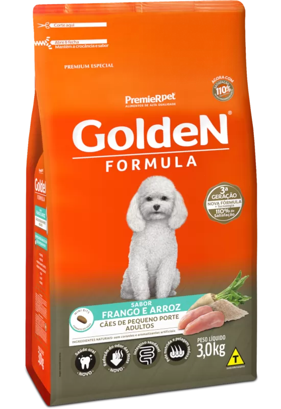 GoldeN® Formula Adultos Frango & Arroz Mini Bits é um alimento Premium Especial desenvolvido para cães adultos de pequeno porte.