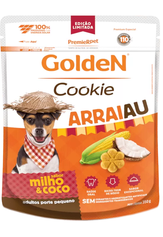 GoldeN® Cookie Cães Adultos Porte Pequeno Arraiau é uma edição limitada recomendada para cães adultos de porte pequeno. Este produto oferece uma combinação exclusiva de milho e coco, que confere um sabor irresistível e proporciona um “arraiau” ainda mais divertido.