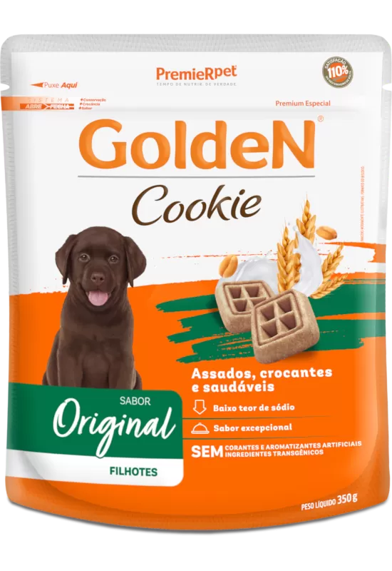 Para tornar os momentos junto ao seu cão mais divertidos e prazerosos a PremieRpet® desenvolveu a linha GoldeN® Cookie, resultado da perfeita combinação de qualidade e sabor, com cookies assados, crocantes e saudáveis. GoldeN® Cookie é cuidadosamente preparado com ingredientes selecionados, sem adição de açúcar, sem corantes e aromatizantes artificiais e sem ingredientes transgênicos.