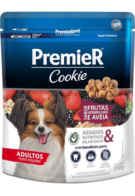 PremieR® Cookie Cães Adultos Frutas Vermelhas & Aveia é indicado para cães adultos de pequeno porte e contém todos os benefícios da linha PremieR® Cookies aliados à exclusiva combinação do morango, amora e aveia, ingredientes saudáveis e que promovem ainda mais sabor aos biscoitos.