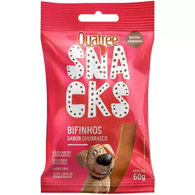 Quatree Snacks Bifinhos é uma delícia de petisco feito com ingredientes especiais que o seu cão vai adorar! Saboroso e nutritivo, é indicado para cães de todas as idades. Quatree Snacks Bifinhos contém prebiótico e zeólita para auxiliar no equilíbrio da flora intestinal, colágeno para manter a pele saudável e macia e hexametafosfato de sódio para reduzir a formação de tártaro e mau hálito. Quatree Snacks Bifinhos alimenta e faz a alegria do seu cão!