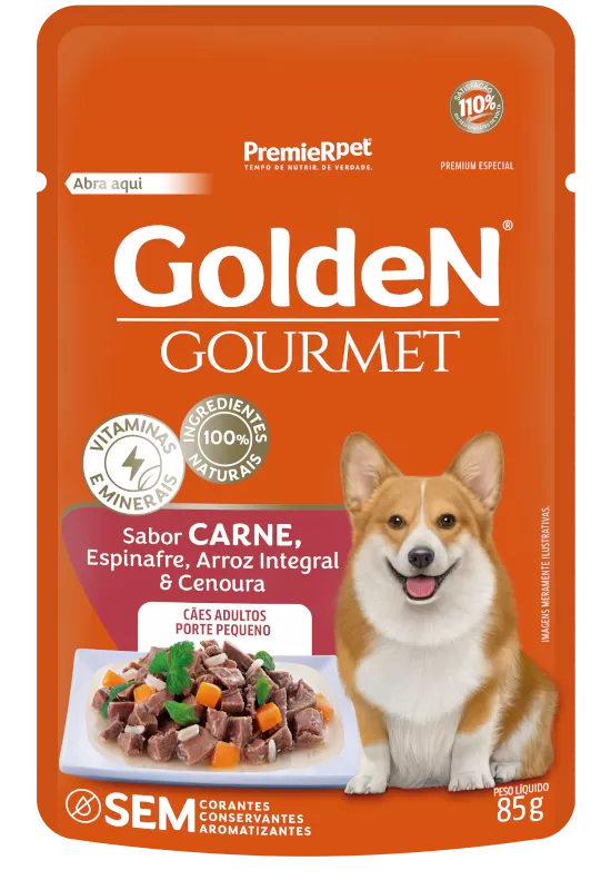 GoldeN® Gourmet Cães Adultos de Porte Pequeno Sabor Carne, Espinafre, Arroz Integral e Cenoura é um alimento Premium Especial que faz parte da linha GoldeN® Gourmet. Este produto é um alimento úmido completo indicado para cães adultos saudável e de porte pequeno.