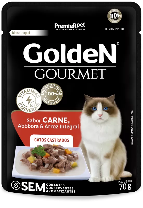 GoldeN® Gourmet Gatos Castrados Sabor Carne, Abóbora e Arroz Integral é um alimento Premium Especial que faz parte da linha GoldeN® Gourmet.