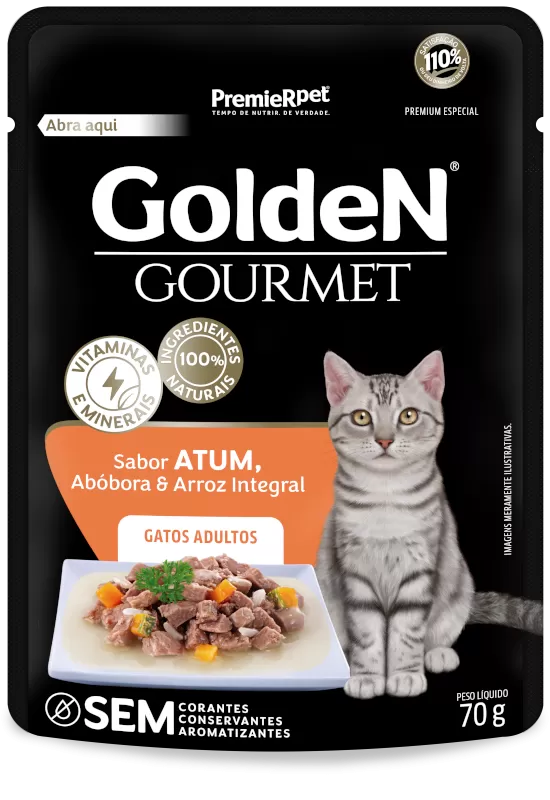 GoldeN® Gourmet Gatos Adultos Sabor Atum, Abóbora e Arroz Integral é um alimento Premium Especial que faz parte da linha GoldeN® Gourmet.