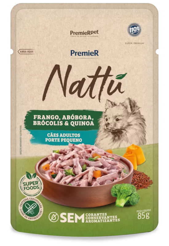 Com uma fórmula sem corantes, conservantes e aromatizantes, PremieR® Nattu – Frango, Abóbora, Brócolis e Quinoa é recomendado como petisco para cães adultos de porte pequeno. Este alimento é preparado com frango desfiado, vegetais e grãos selecionados, em um molho irresistível.