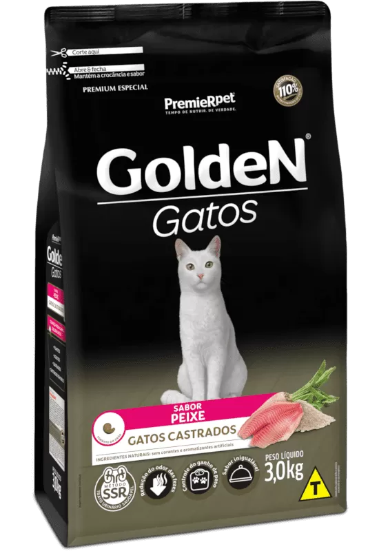 GoldeN® Gatos Castrados Sabor Peixe é um alimento completo, balanceado e rico em nutrientes, indicado para gatos castrados a partir dos 6 meses de idade e contraindicado para filhotes de idade inferior a 6 meses, fêmeas gestantes e lactantes, devido ao seu reduzido teor calórico.
