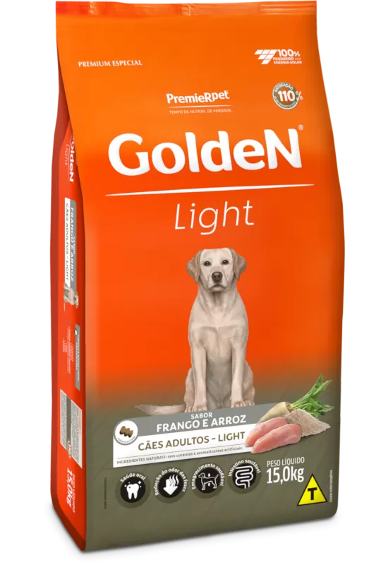 GoldeN® Formula Light Cães Adultos é um alimento cientificamente balanceado para promover a perda e manutenção de peso saudáveis no seu cão.