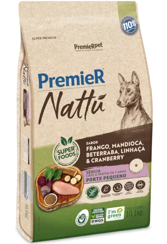 Com uma fórmula sem corantes e aromatizantes e buscando acompanhar o cão em todas as fases da vida, PremieR® Nattu Cães Senior Pequeno Porte Mandioca é recomendado para a alimentação de cães seniores e traz em sua base de ingredientes Frango, Mandioca, Beterraba, Linhaça e Cranberry, itens de alta densidade nutricional, que oferecem muitos nutrientes e poucas calorias, proporcionando uma dieta mais equilibrada para seu cão, além de benefícios específicos para essa fase da vida, como o cuidado articular e o envelhecimento saudável.