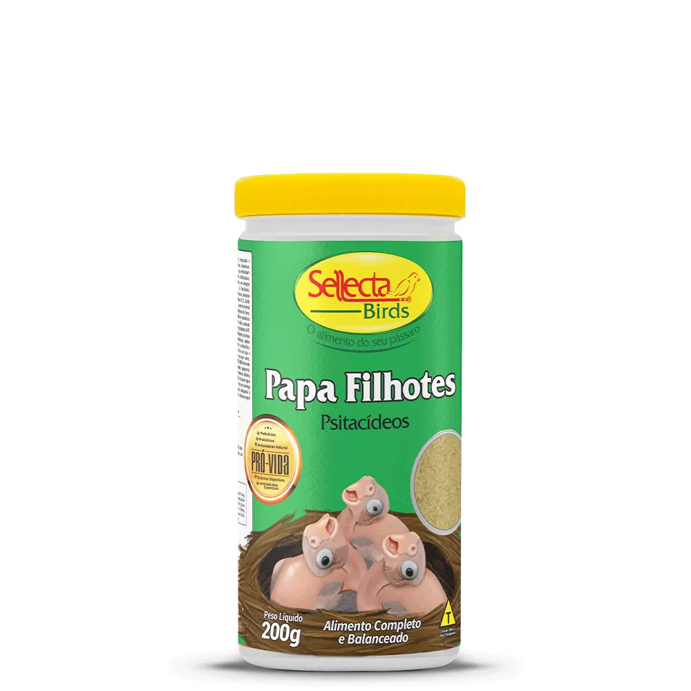 Papa Filhotes Psitacídeos Sellecta é um alimento completo e balanceado, extrusado e micronizado, indicado para filhotes psitacídeos, enriquecido com minerais, vitaminas, prebióticos, probióticos, antioxidante natural, enzimas digestivas e aminoácidos, que estimulam um desenvolvimento vigoroso e saudável. Também indicado para aves debilitadas.
