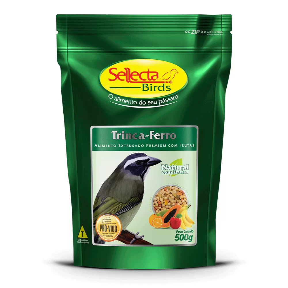 Sellecta Extrusado Trinca-Ferro Natural com Frutas é um alimento premium, completo e balanceado, com ingredientes naturais, minerais orgânicos e frutas, indicado para trinca-ferro e outros pássaros onívoros adultos e de mesmos hábitos alimentares, em período de manutenção.
