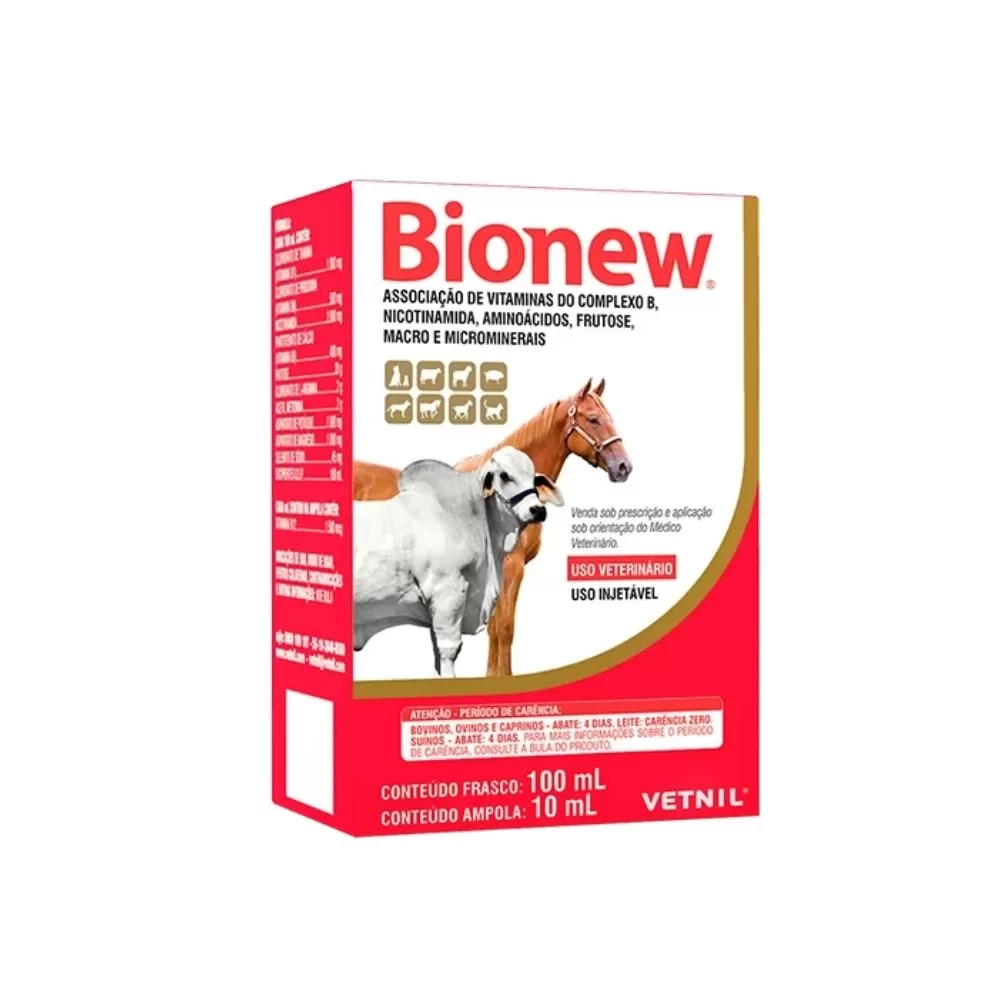 Bionew® é composto por vitaminas do complexo B (nicotinamida, dexpantenol, piridoxina e cianocobalamina), aminoácidos (arginina e metionina) e butafosfana (fonte de fósforo orgânico), indicado para tratamentos de quaisquer estados carenciais desses componentes em equinos e ruminantes.