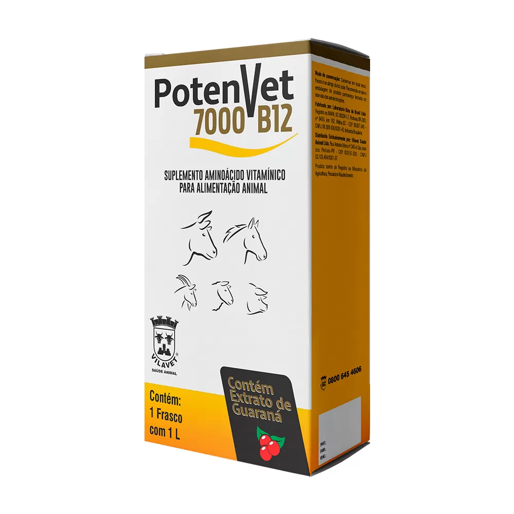 INDICAÇÃO DO PRODUTO : Potenvet 7000 B12 e um suplemento composto por aminoacidos e vitaminas indicado para uso em bovinos,equinos, suinos, ovinos, caprinos, caes e gatos, que visa a melhora das condiçoes de crescimento, manutençao e ganho de peso.