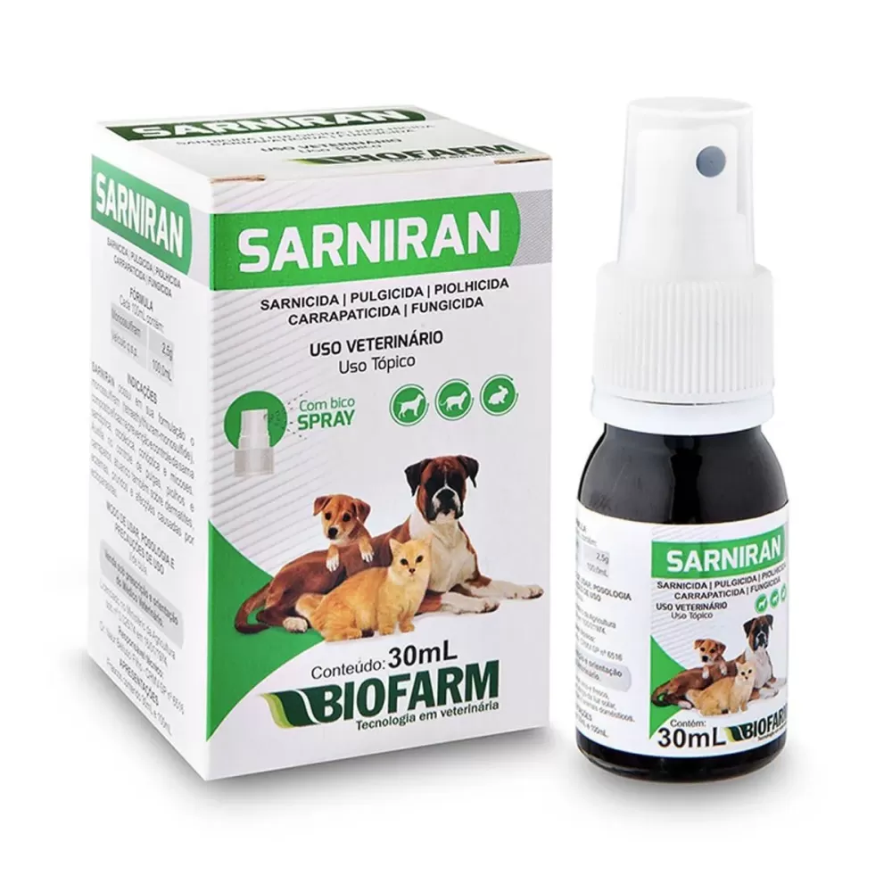Sarniran possui em sua formulação o monossulfiram, composto eficaz na prevenção e controle da sarna sarcóptica, otodécica, corióptica e micoses.