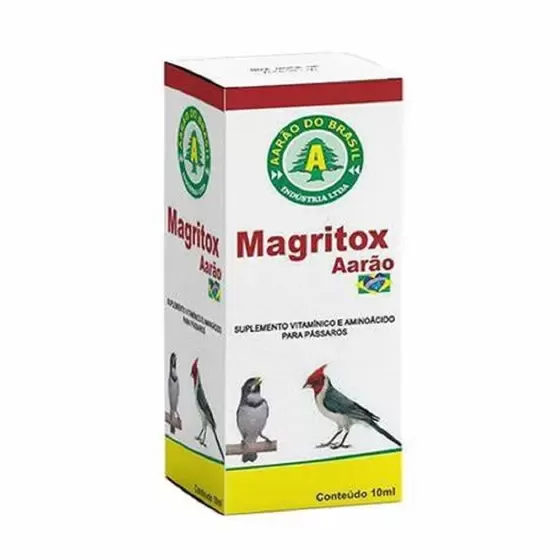 MAGRITOX - AARÃO Suplemento Vitamínico e Aminoácido para pássaros. INDICAÇÃO DE USO: Magritox Aarão é um suplemento aminoácido, composto por Metionina, Lisina e Colina, indicado para animais, em todos os casos em que seja necessária a suplementação dos componentes presentes nesta formulação, visando maior bem-estar dos animais. É um complemento nutricional importante para animais de pequeno, médio e grande portes, sendo um suporte nutricional para animais de todas as fases. MODO DE USAR: Para ser usado por via oral, misturado à água de bebida. Pássaros Pequenos: 6 gotas em 50 mL na água de beber, por 10 dias consecutivos. Pássaros grandes: 12 gotas em 50 mL na água de beber, por 10 dias consecutivos. Criadouros de pássaros: 120 gotas em 1L na água de beber, por 10 dias consecutivos. Manutenção: 3 vezes por semana.