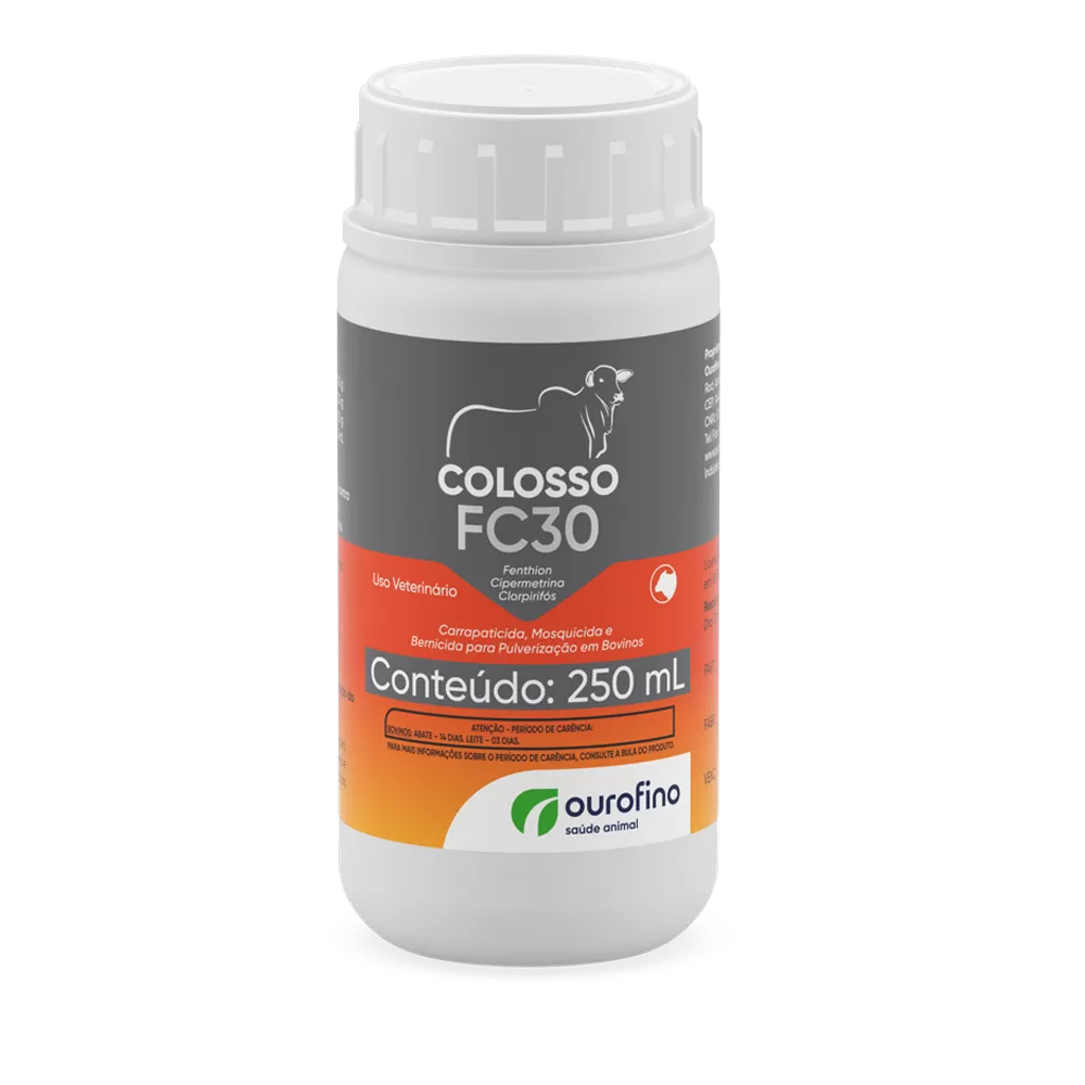 Com a calda, pulverizar toda a superfície do animal incluindo orelha, barbela, axilas, virilhas, o início da cauda e toda a parte inferior do animal, deixando-o completamente molhado e garantindo assim um banho completo e que todas as partes do corpo recebendo o produto 3 a 5 litros de calda geralmente são suficientes para molhar todo o corpo do animal, o que corresponde a aproximadamente 3,7 a 6,2 ml de COLOSSO FC30/ animal.