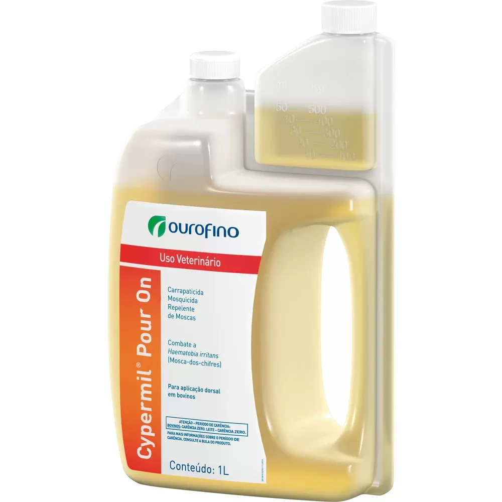Carrapaticida - Elimina todas as fases do carrapato dos bovinos Boophilus microplus.Mosquicida e repelente - Elimina as moscas adultas vetoras da mosca do berne Dermatobia hominis,Musca domestica e Stomoxys calcitrans.Combate a Haematobia irritans mosca-dos-chifres.Posologia e modo de usar:A dosagem recomendada é de 10 ml para cada 100 kg de peso vivo, obedecendo a tabela:Peso Dose 100 kg 10 ml 200 kg 20 ml 300 kg 30 ml 400 kg 40 ml 500 kg 50 ml Dosagem para combate à mosca-dos-chifres: apenas 10 ml.Para animais acima de 500 kg de peso vivo a dose máxima recomendada é de 50 ml.O produto deverá ser aplicado em toda linha dorsal dos bovinos, da inserção da cauda, até o meio do pescoço.Administração:O produto deverá ser aplicado em toda linha dorsal dos bovinos, da inserção da cauda, até o meio do pescoço.Precauções:Usar sempre a luva que acompanha o produto, ao manusear o mesmo.Conservar o produto na embalagem original, em local seco e fresco, ao abrigo da luz solar.Guardar fora do alcance de crianças e animais domésticos.Não guardar junto de alimentos, medicamentos, bebidas, produtos de higiene e domésticos.Não reutilizar embalagens vazias.Desaconselhamos a aplicação do produto nas horas de calor intenso, ou nos dias chuvosos.Não jogar o produto ou restos da embalagem em açudes, rios e tanques de água.Produto tóxico para peixes.Aplicação sob orientação do Médico Veterinário.Grupo químico:Piretróide.Não possui antídoto. Aplicar tratamento sintomático.Se ocorrer intoxicação humana, chamar imediatamente o médico, e enquanto isso, caso tenha ocorrido ingestão acidental do produto, provocar vômito, introduzindo o dedo na garganta, ou por via oral, administrar um copo de água morna. Repetir até que o vômito seja um líquido claro. Se possível entregue ao médico a embalagem do produto. Se o produto atingir os olhos, lavar imediatamente com água abundante, durante 15 minutos.Cypermil® Pour On não deixa resíduos na carne ou no leite.Apresentação:Frasco de plástico com 250 e 1.000 ml e galão plástico contendo 5.000 ml.Classe Terapêutica:ECTOPARASITICIDAS (ANTI-PARASITÁRIOS)Princípio(s) Ativo(s):CIPERMETRINARegistro no Ministério da Agricultura,
