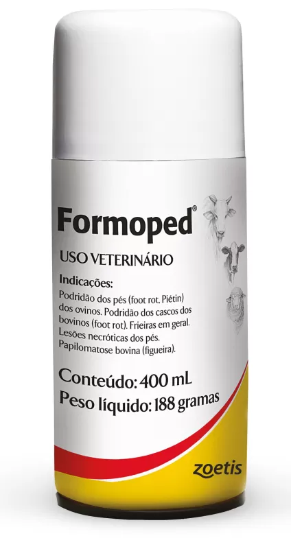 Formoped® é um potente bactericida e antisséptico, que não se altera na presença de matéria orgânica; destrói o tecido superficial das lesões ulceradas, excrescências e infiltrações infecciosas no córion dos cascos e entre as unhas dos animais.