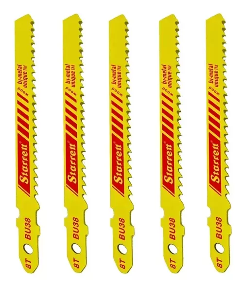 Lâmina de Serra Tico Tico 5 Unidades BU38 STARRETT As Lâminas de Serra Tico Tico com encaixe unificado Starret são fabricadas com o novo AÇO BI-METAL UNIQUE e portanto incorporam a sua avançada performance de corte, ou seja, a nova STARRET Bi-Metal Unique Saw Technology. Promovendo cortes suaves e precisos. DADOS TÉCNICOS: Uso indicado: Madeira Peso: 0,500 kg Quantidade: 5 Unidades Garantia: 3 meses Referência: BU38-100 Marca: Starrett